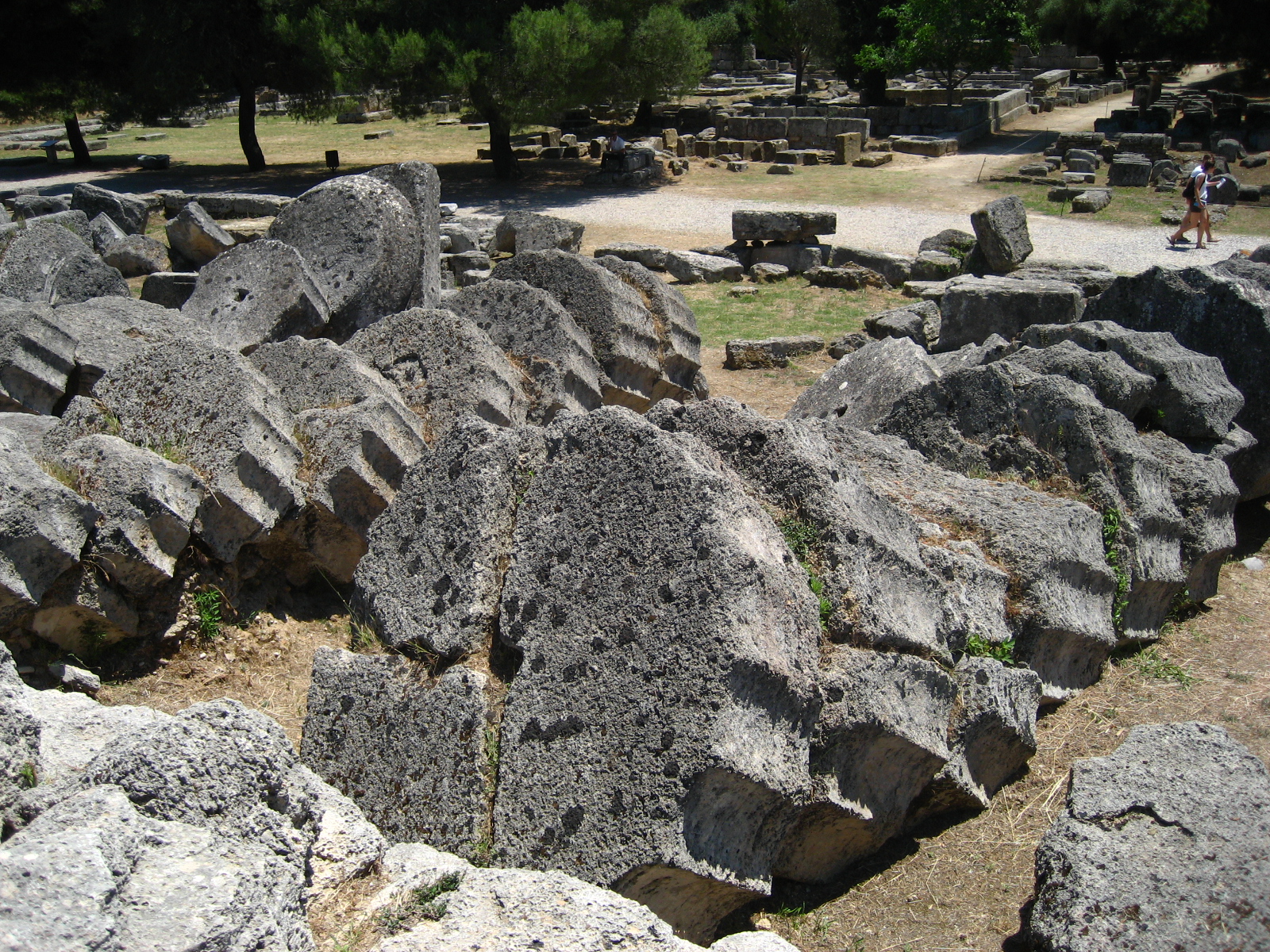 Ruins of the Temple of Zeus. These are columns that have fallen over. In this temple was a huge statue of Zeus, which was one of the seven ancient wonders of the world: