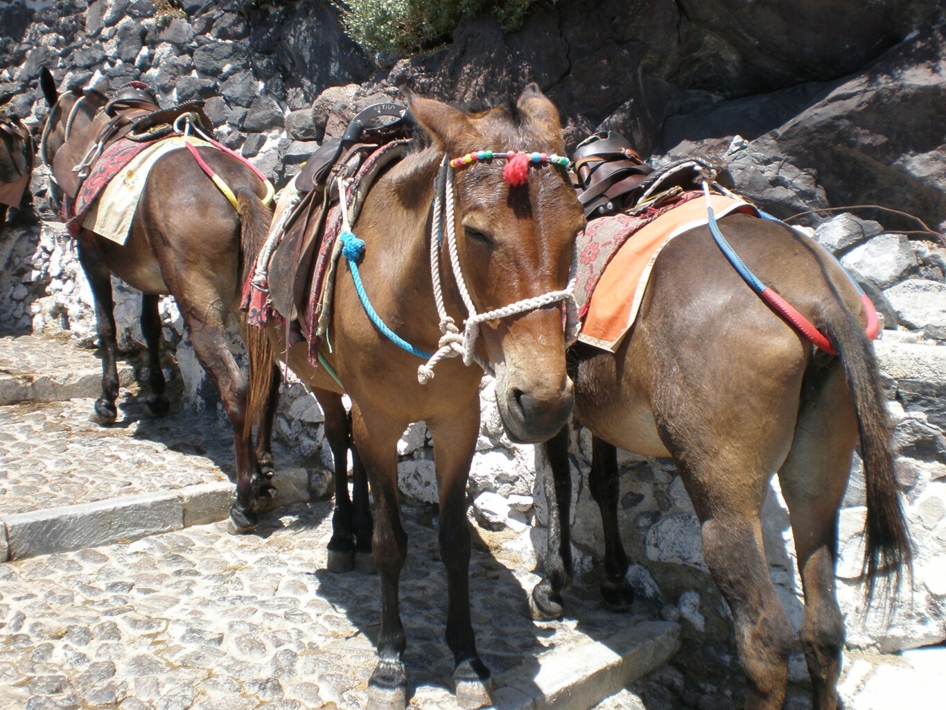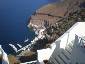 Santorini was the most spectacularly beautiful place we visited. Fira, where we spent our day, is a typically charming Greek island village–boxy white houses, little domed churches, and winding alleyways–perched on the edge of a cliff that falls off into the bright blue waters of the caldera. Over and over again, you find yourself just standing and looking at the view, marveling that any place can be so utterly lovely. The trip was notable in that there were several places that had so much of some form of visual treasure that by the end of the day you wind up totally sated, to the point that you don’t really care if you see any more of whatever that special thing is. In Venice, it’s canals; in the National Archeological Museum in Athens, it’s ancient sculptures; in Delos, it’s ancient ruins; and, in Santorini, it’s spectacular views.