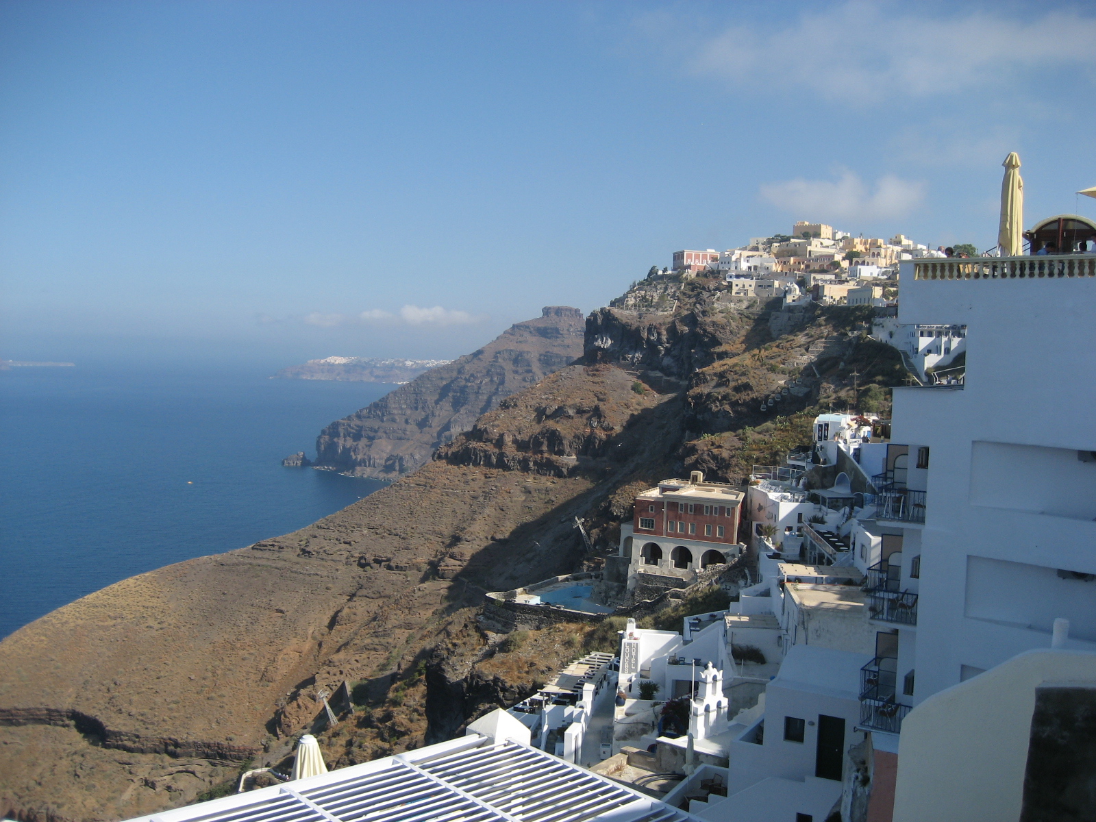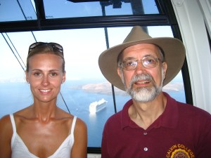 We turned around and walked back. On the way, we stopped at one of the cafes overlooking the caldera and had a light lunch: Mary had a greek salad, I had some dolmathes (stuffed grape leaves), and my Dad had grilled cheese (not a grilled cheese sandwich; this was literally grilled cheese) and some of that famous Greek liqueur, Ouzo. I tried a little bit of it, and liked it. It is flavored with anise, which means that it tastes a little like licorice. At the end, we all split some baklava. Here is a picture of Mary and I at the cafe: