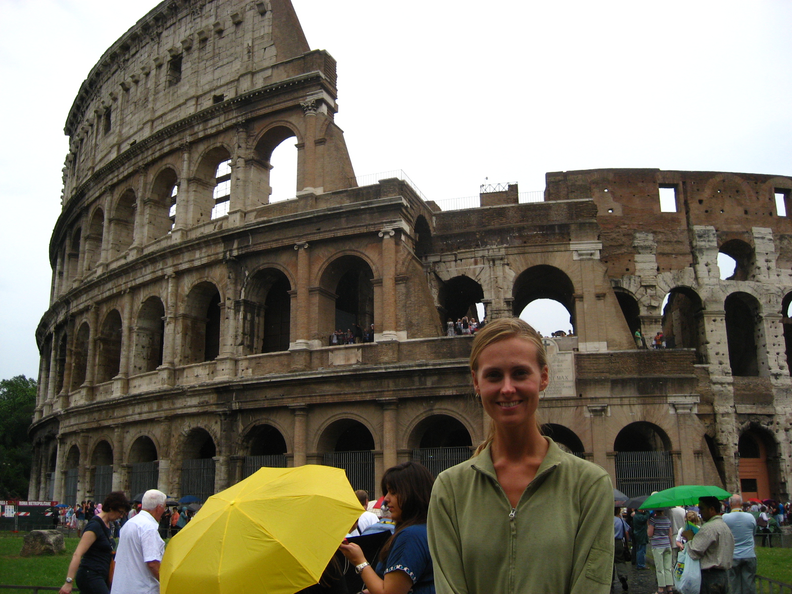 We headed south toward the Colosseum, and stopped for lunch along the way. By the time we got there, it was raining: