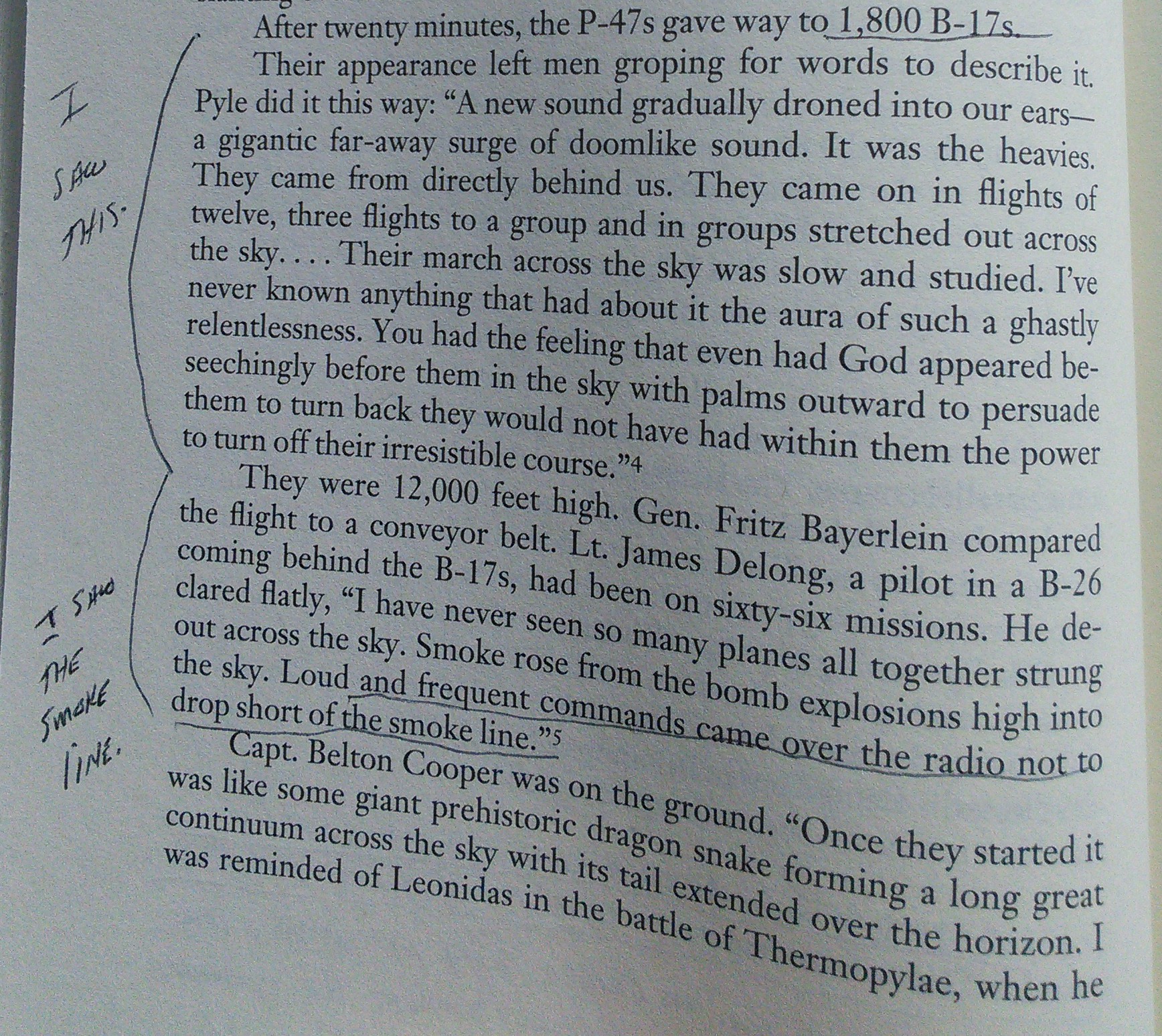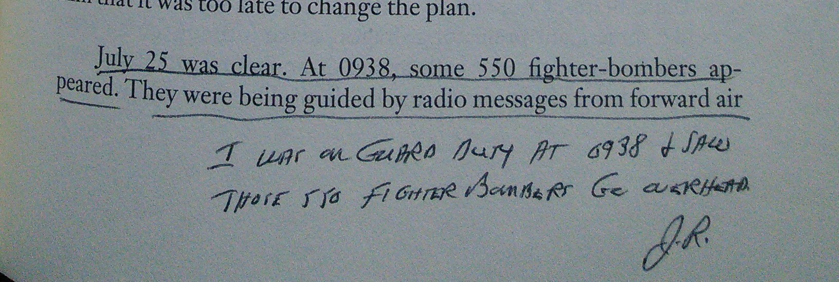 Grandpa loved to tell stories of his time in the service during World War II, and his family loved to hear them. When I was in Grand Rapids for his memorial service, I pulled out one of his books about the war, Stephen Ambrose’s Citizen Soldiers. I found that he had occasionally underlined and written notes on events in the book that he had a personal connection to, particularly those having to do with Operation Cobra toward the end of July, 1944.